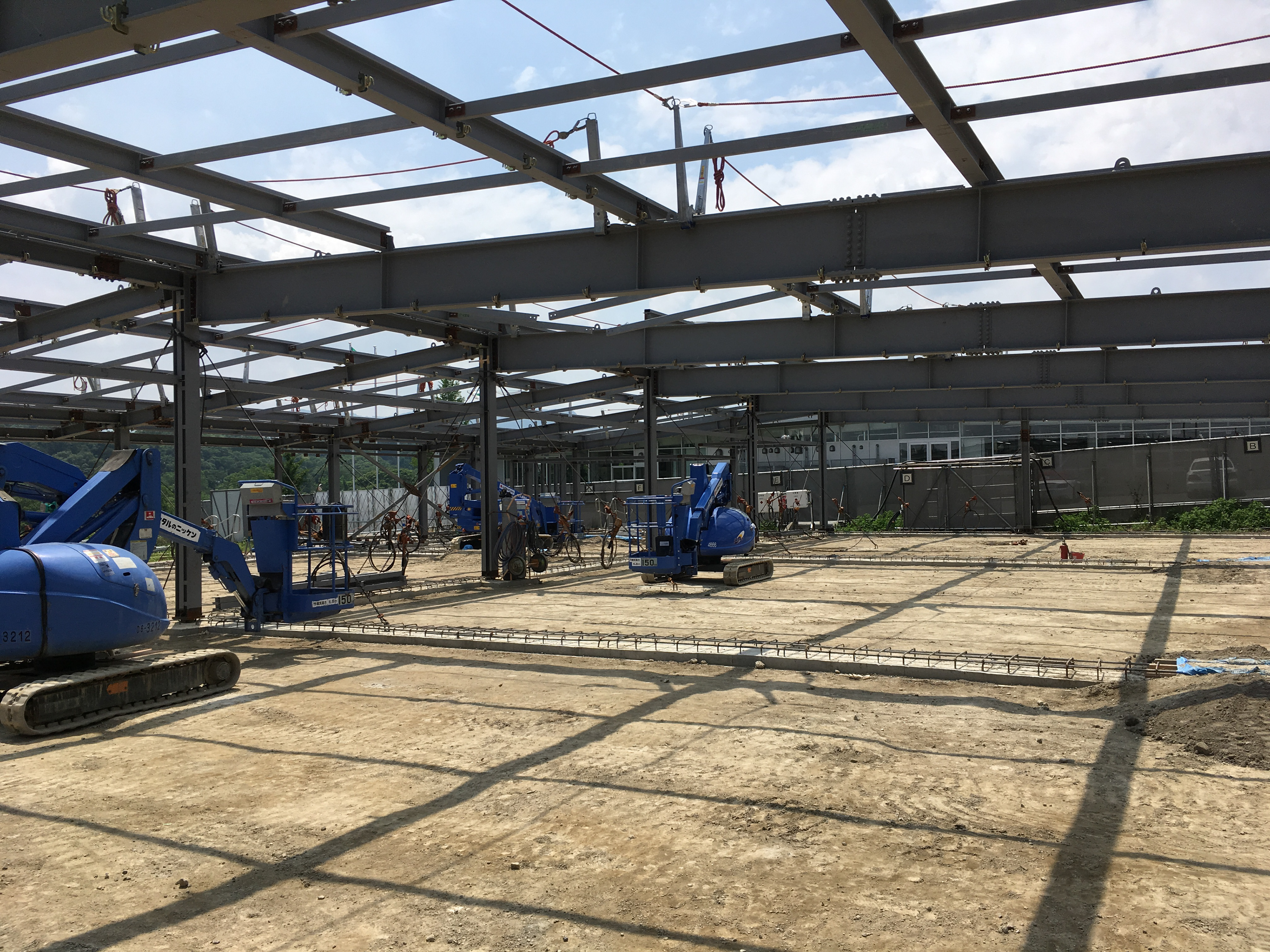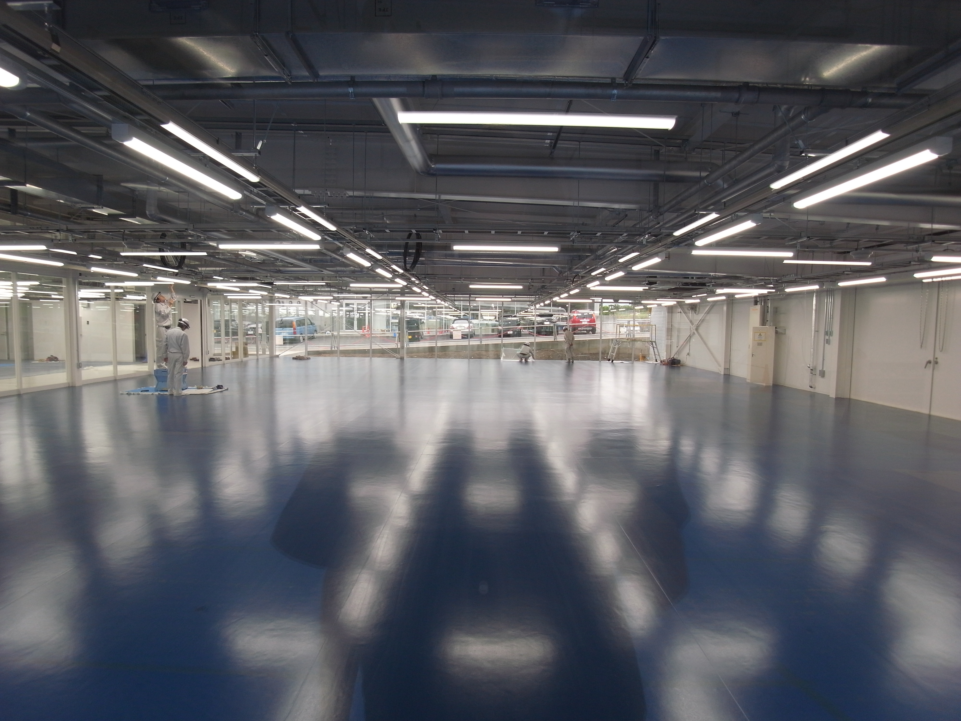 荒川を臨む敷地に立つ工場。大空間かつ開放的なガラス張りとするために最小限の壁配置のユニバーサルスペースとすることで、将来的な用途変更にも対応可能となっている。部材の標準化を行うことで構造コストを最小限に抑え、設備の充実にあてている。