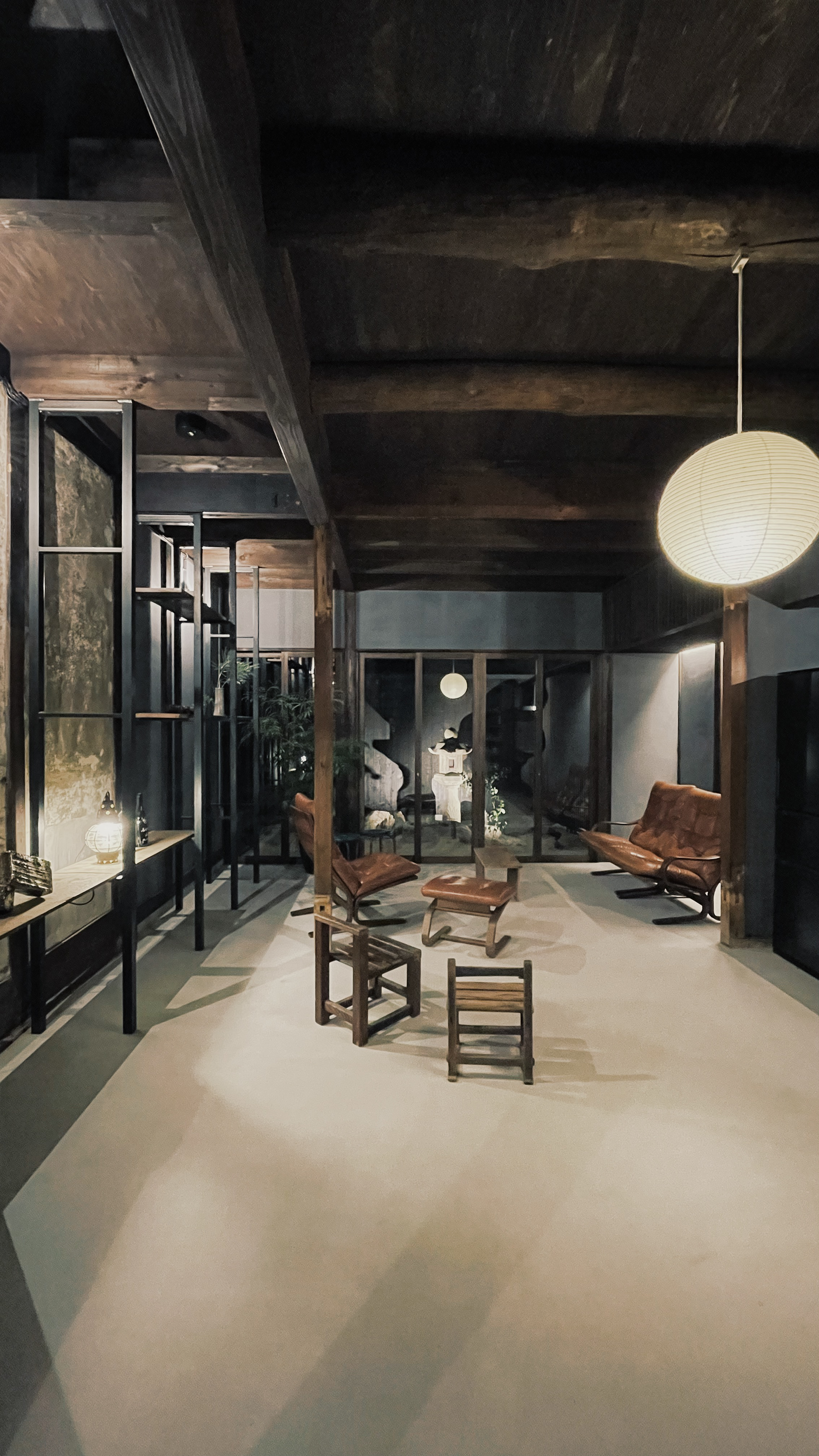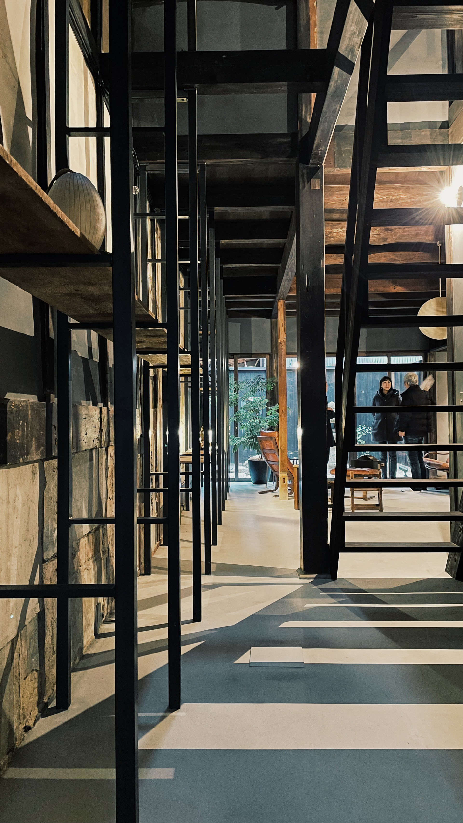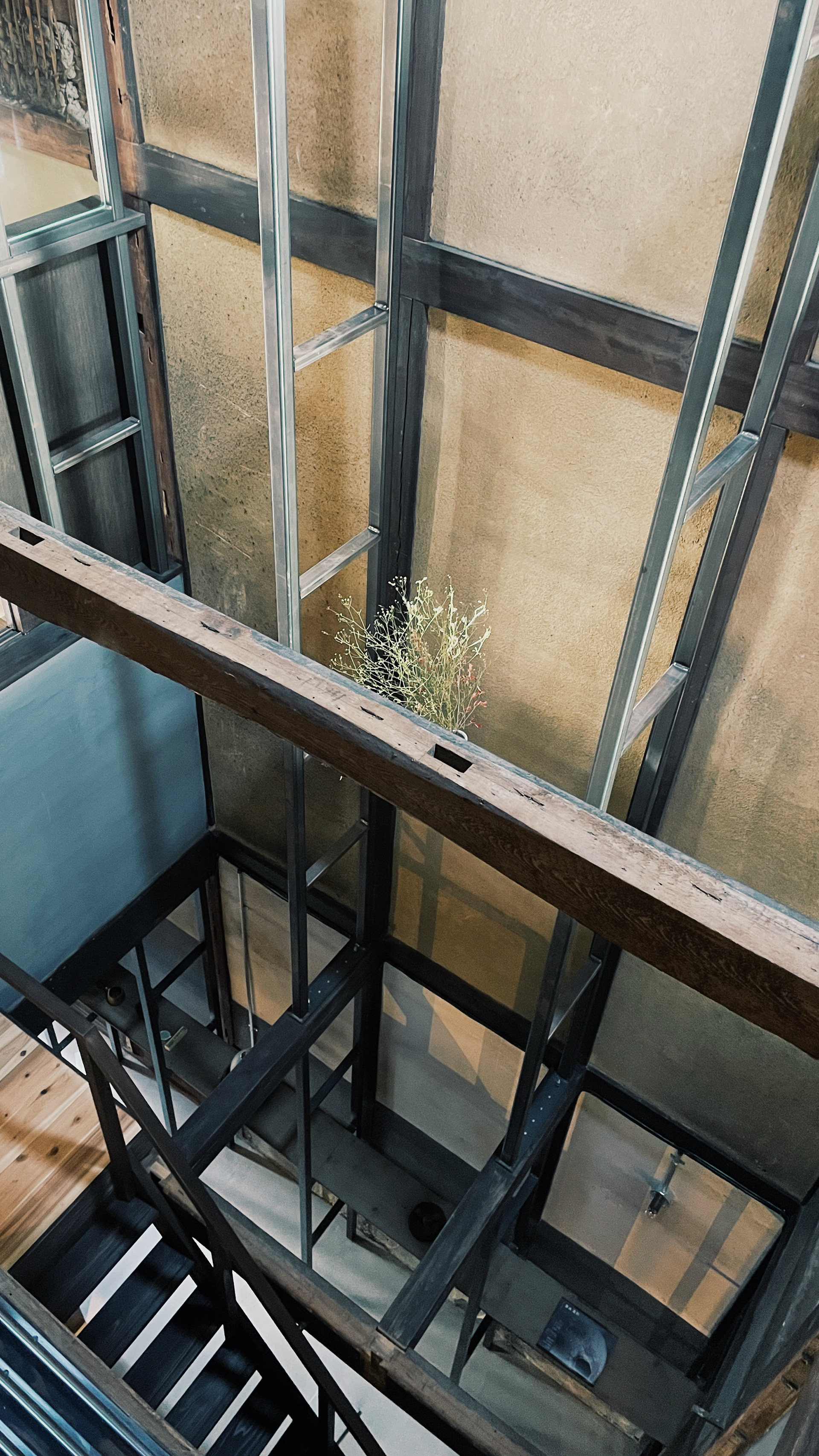 京都市に位置する町家を改修し、海外在住の芸術家の拠点とするためのプロジェクト。本計画では、既存の土壁と同等のせん断剛性を持つスチールフレーム「耐震シェルフ」を開発し、建築と家具の間のスケールで耐震補強を行う。面材や筋交いのような高剛性の補強を施すと応力集中が発生し、境界梁に悪影響を及ぼす恐れがあるため、柔軟な構造体を挿入することで既存を含めた耐震要素にバランスよく地震力を分担させ、既存躯体への負担を抑えている。